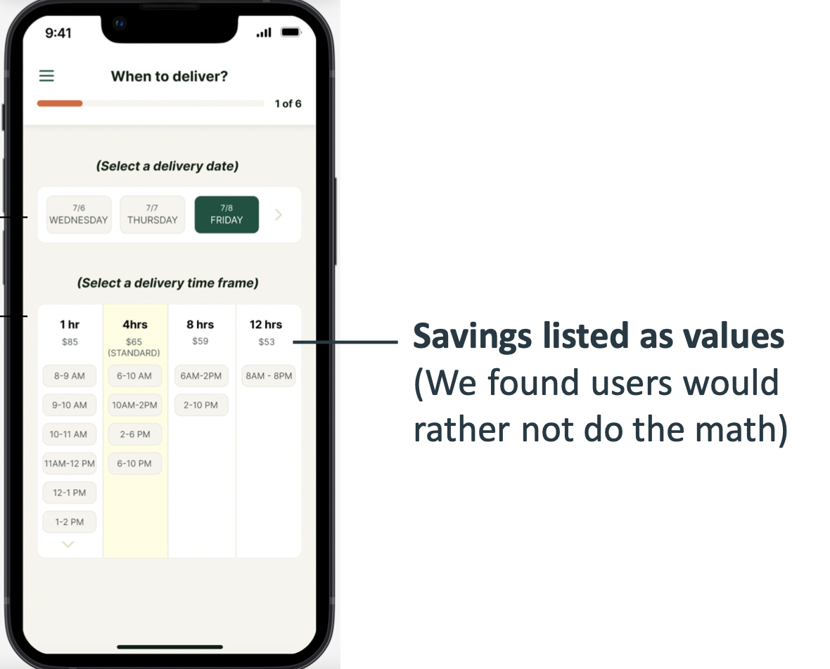 Thus, we came up with the solution to attempt to create an easy way for customers to select a range of delivery dates, see time windows available, and price differences.