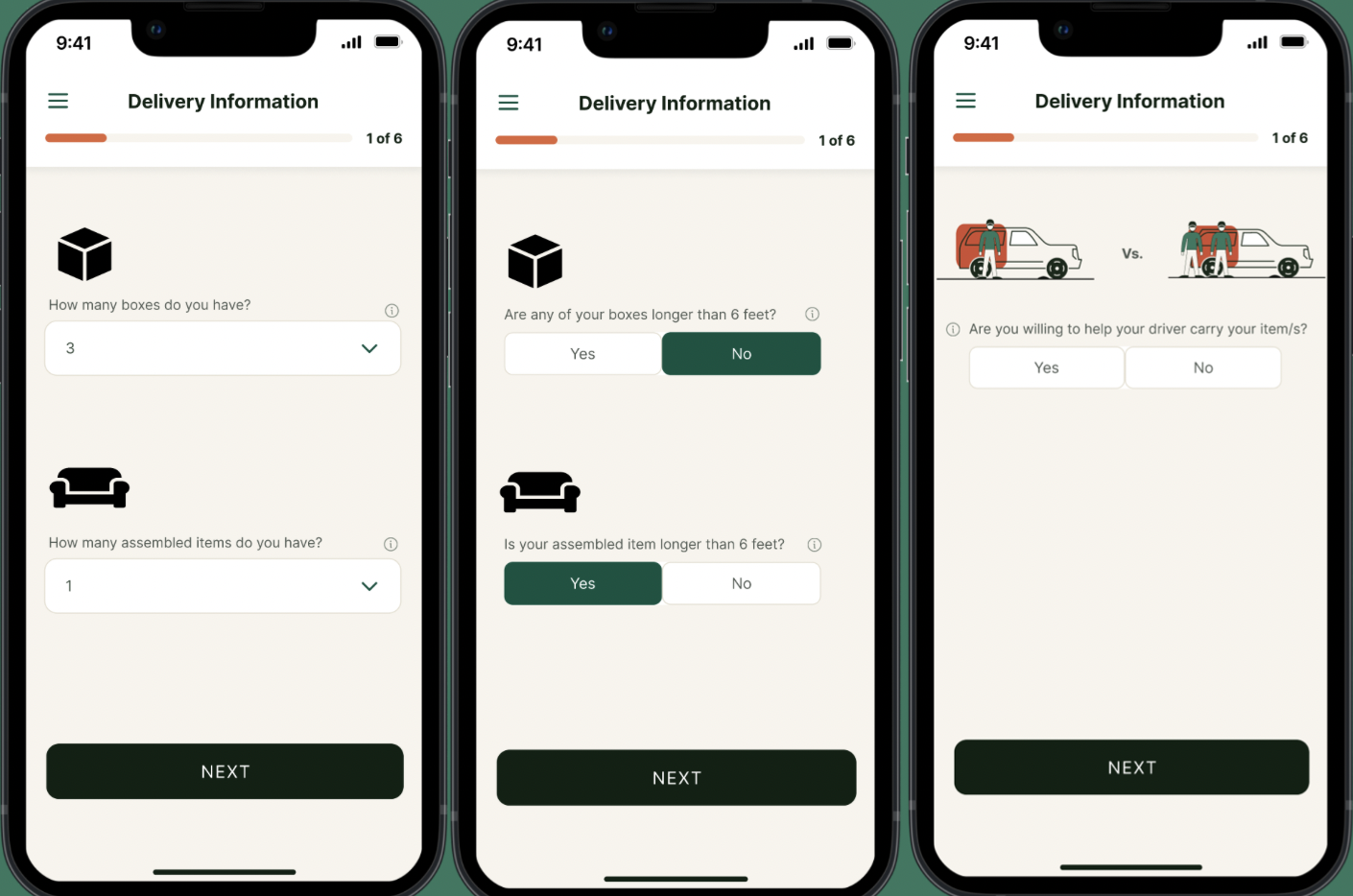We believed the service choice step should be as seamless and simple as possible. Thus, we came up with the solution to assign the correct vehicle to the customer by asking them a few questions about their delivery. This way, customers will not have information they do not need, and they will not have the incentive to game the system.